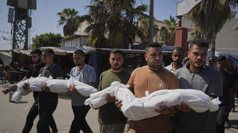 Des proches portent les corps de deux sœurs palestiniennes, Mira, 8 ans, et Sabah Bashir, 10 ans, tuées lors d'une frappe aérienne de l'armée israélienne sur la bande de Gaza. [Deir al-Balah, le 2 juillet 2025]