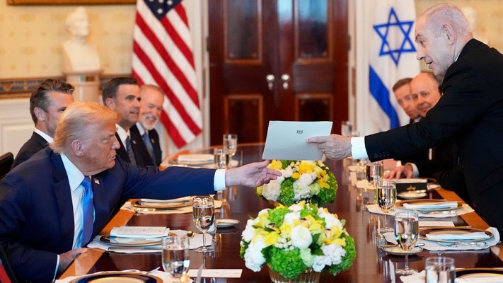 Le Premier ministre israélien Benjamin Netanyahou, à droite, remet un dossier au président Donald Trump lors d'une réunion dans la salle bleue de la Maison Blanche, lundi 7 juillet 2025, à Washington. [AP Photo/Alex Brandon]