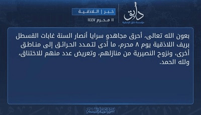 La Fondation Dabiq News a rapporté que «les combattants d'Ansar al-Sunna ont brûlé les forêts de Qastal dans la campagne de Lattaquié le 8 Muharram (3 juillet)», ajoutant que les incendies se sont propagés à d'autres zones, «entraînant le déplacement des Nusayris (Alaouites) de leurs maisons, et un certain nombre d'entre eux souffrant d'asphyxie».