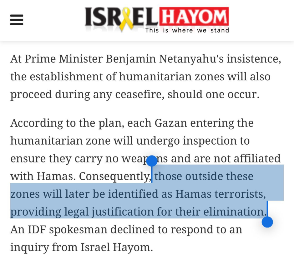 « (...) En conséquence, Tout Gazaoui en dehors de ces zones sera considéré comme un terroriste du Hamas, justification légale pour son élimination. »