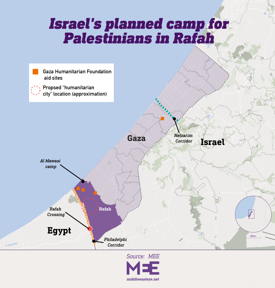 Rayhan Uddin, 10 juin 2025. Israel Katz la qualifie de « ville humanitaire », d'où les Palestiniens seront encouragés à « émigrer volontairement » hors de Gaza. Mais les analystes estiment que le ministre israélien de la Défense, qui a dévoilé cette semaine son projet de confiner plus de deux millions de Palestiniens dans une petite zone du sud de Gaza, utilise un langage biaisé.