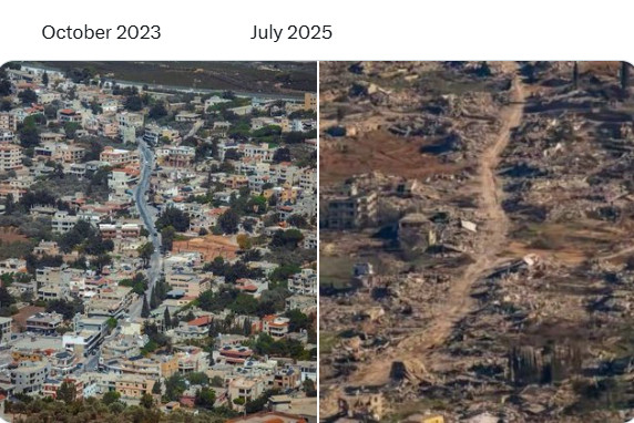 Kfar Kila, au Sud-Liban, avant et après sa destruction totale par Israël. ( source)