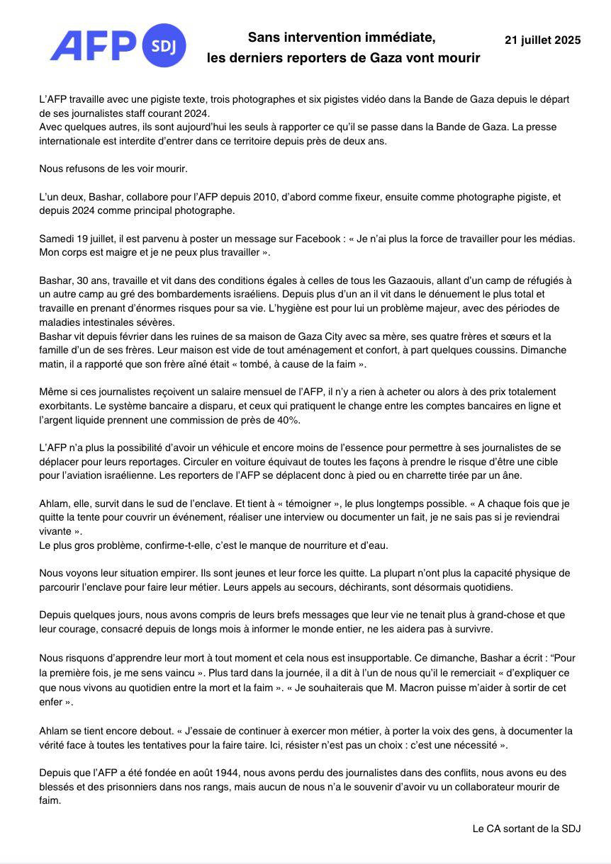 L'AFP prévient que ses derniers journalistes à Gaza risquent de mourir de faim et d'épuisement. Coupés du monde extérieur, ils couvrent leurs reportages sous siège, sans nourriture, sans carburant et sans soins médicaux.