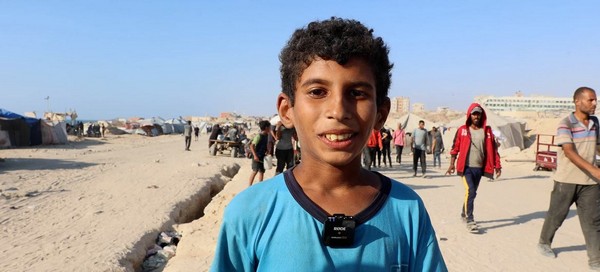 Mohammed Mudeiris, un enfant qui a perdu son père dans une frappe aérienne israélienne, vient chercher de la nourriture pour ses frères et sœurs dans des camions d'aide arrivant via le point de passage de Zikim.