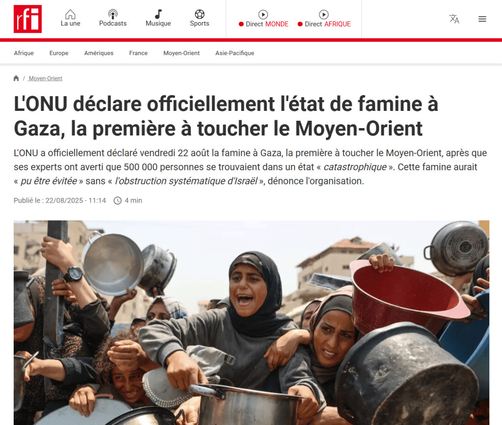 «L'ONU a officiellement déclaré vendredi 22 août la famine à Gaza, la première à toucher le Moyen-Orient, après que ses experts ont averti que 500 000 personnes se trouvaient dans un état «catastrophique». Cette famine aurait «pu être évitée» sans «l'obstruction systématique d'Israël», dénonce l'organisation.