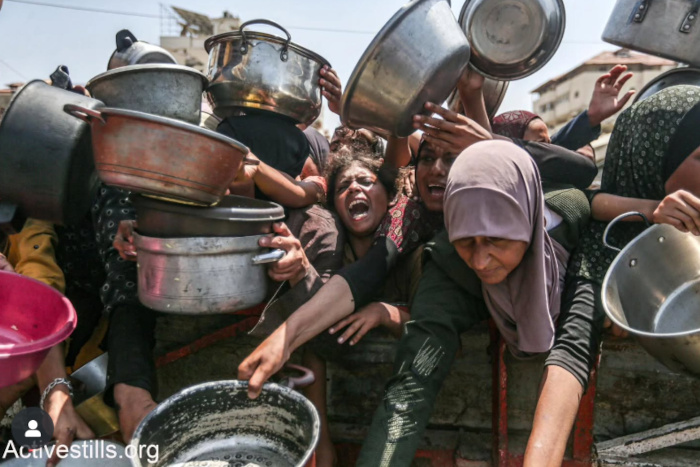 17 août 2025 - Des Palestiniens tentent de se frayer un chemin sous un soleil de plomb, dans l'attente de recevoir de la nourriture distribuée par une cuisine solidaire à Gaza City, alors que la famine sévit à Gaza en raison du blocus israélien. Selon le ministère de la Santé de Gaza, 11 personnes sont mortes de faim au cours des dernières 24 heures. Les Palestiniens continuent de risquer leur vie pour obtenir de la nourriture lors des distributions du GHF, où les gens sont régulièrement attaqués et tués - Photo : Yousef al-Zanoun / Activestills
