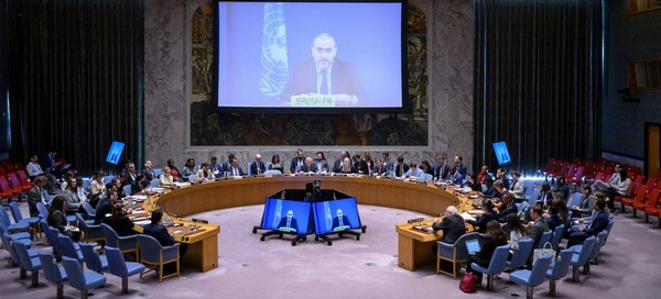 UN Photo/Loey Felipe. Réunion du Conseil de sécurité sur la Palestine. Le Coordonnateur résident et humanitaire des Nations Unies, Ramiz Alakbarov (à l'écran), informe les membres du Conseil.