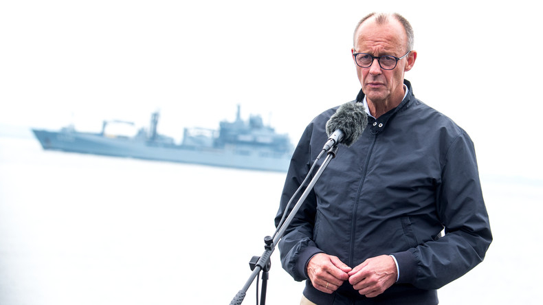 Friedrich Merz, le chancelier allemand, s'exprime devant la frégate de chasse sous-marine «Bayern» lors d'une visite de la marine allemande le 28 août 2025 près de Rostock (photo d'illustration).
