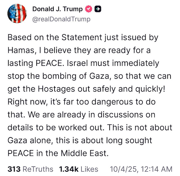 Le Hamas a accepté vendredi la proposition de plan de paix émise par Trump, c'est a dire la restitution en une seule fois des 48 otages israéliens vivants et morts, ainsi que la mise en place provisoire d'un comité de gestion palestinien de « technocrates » pour gérer la bande de Gaza, tout en soulignant la nécessité de respecter en échange les clauses sur le retrait de l'armée israélienne, l'arrêt des massacres, la libération des otages palestiniens et la mise en place d'un Etat palestinien autonome.