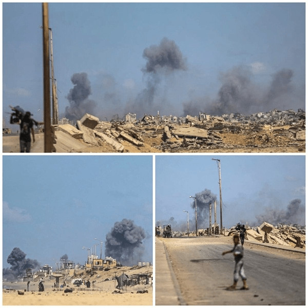 Depuis dimanche matin, l'artillerie bombarde tous les quartiers de la ville de Gaza, des rues Jala' et Nasr au nord jusqu'à la rue Al-Thalathini au sud. L'ennemi a également détruit tous les bâtiments de l'université Al-Azhar dans le quartier d'Al-Maghraqa, au sud de la ville. Ses avions ont lancé des dizaines de raids sur les quartiers de Chuja'iyya, Rimal et Sabra, la rue al-Nafaq, qui a été bombardée à plusieurs reprises.
