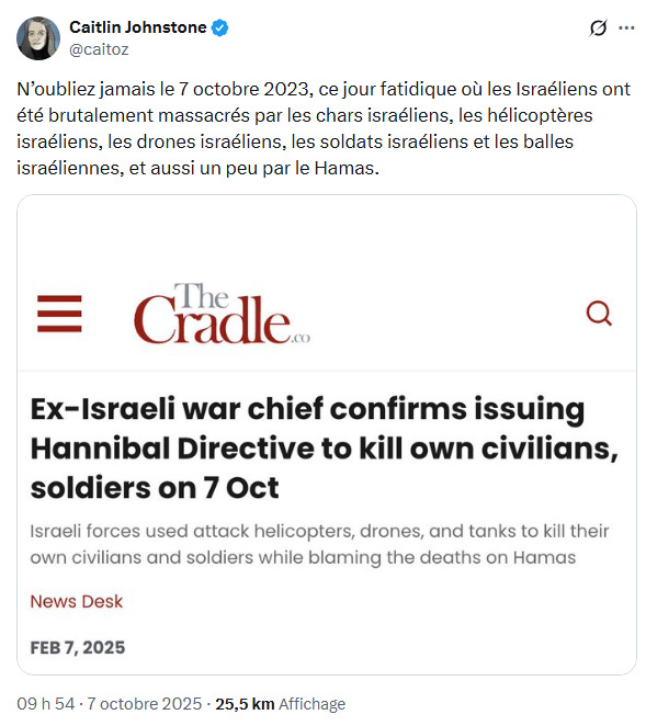 Message de Caitlin Johnstone partageant un article de The Cradle sur l'application de la directive Hannibal