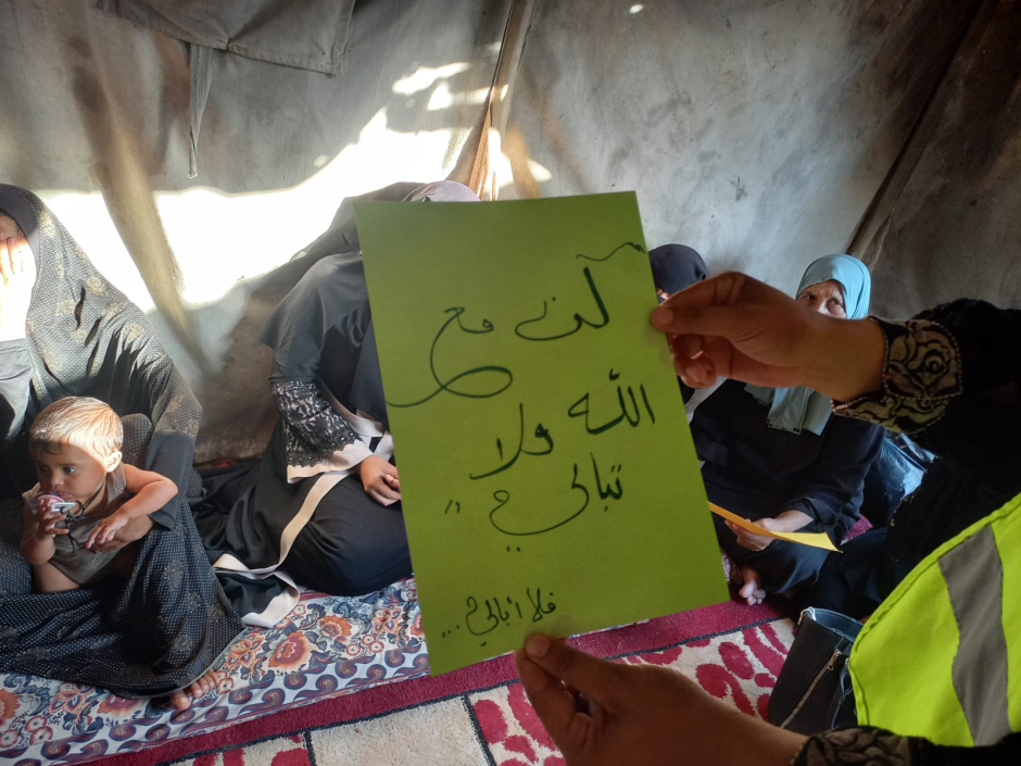 « Par un après-midi gris, alourdi par les souvenirs de l'exil et le bruit du vent frappant les tentes de l'ouest de Deir al-Balah, vingt femmes déplacées se sont réunies dans une petite tente du « camp des amis » à Deir al-Balah. L'objectif de cet atelier, organisé par l'équipe de l'UJFP, était de leur offrir une chance unique de découvrir une force intérieure longtemps recouverte par la poussière de la souffrance, en les formant aux techniques de flexibilité cognitive et au changement des schémas de pensée négatifs ancrés par les pressions du déplacement et les conditions de guerre.