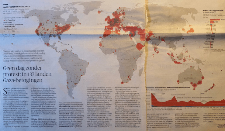 Ces deux dernières années, des citoyens du monde «sont descendus dans la rue dans 137 pays concernant [la guerre à] Gaza, une vague de protestations sans précédent. À titre de comparaison, lors des manifestations mondiales contre la guerre qui ont précédé la guerre en Irak en 2003, des manifestations ont eu lieu dans 100 pays, selon les estimations les plus larges», écrit le journal mainstream néerlandais Volkskrant, le 7 octobre 2025. 1