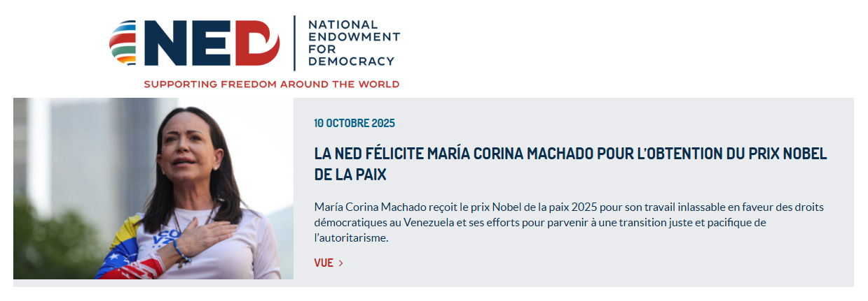 La NED qui a très largement financé l'opposition vénézuélienne, n'a pas tardé à féliciter Maria Corina Machado pour son Prix Nobel