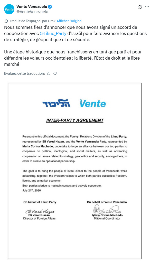 Le parti de Maria Corina Machado « Vente Venezuela » a signé un accord de coopération avec le Likoud en 2020, actuel parti de Benjamin Netanyahou