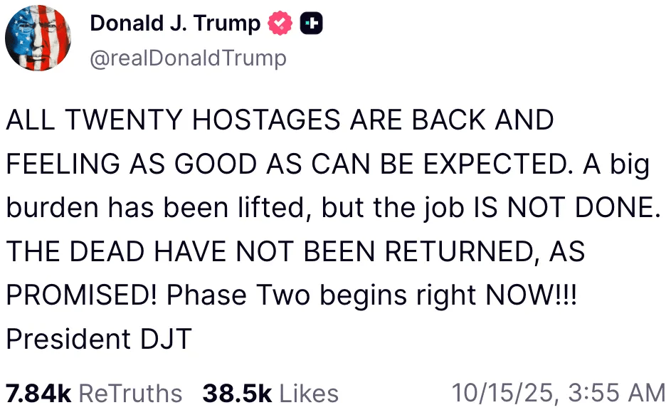 Et le président Trump semble être d'accord avec cela,  postant sur Truth Social que «Un lourd fardeau a été levé, mais le travail N'EST PAS TERMINÉ. LES MORTS N'ONT PAS ÉTÉ RESTITUÉS, COMME PROMIS !»