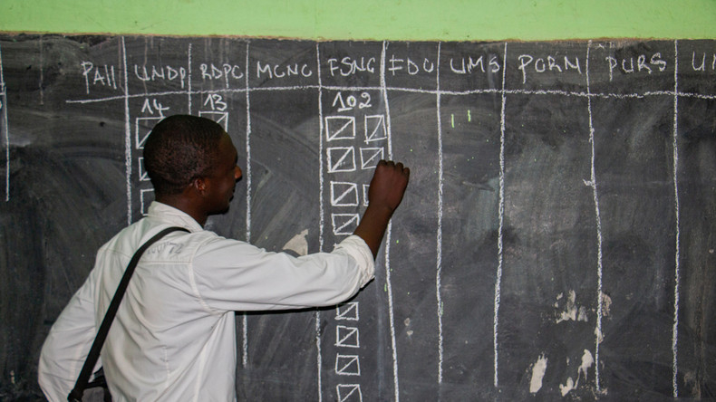 Un agent électoral inscrit les résultats sur un tableau lors du dépouillement des bulletins à Garoua, au Cameroun, le 12 octobre 2025.