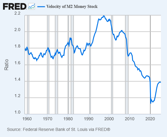 The velocity of money has been in a free-fall from the dot-com era peak which was the last spurt of "growth" that actually trickled down to wage earners. Here is the chart of M2 money velocity--a multi-decade decline: