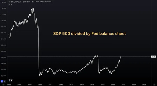 But when the 2008 bubble #2 popped, the Fed had to print / backstop trillions of dollars to inflate this final bubble #3. This chart shows the SPX stock index divided by the Fed balance sheet: