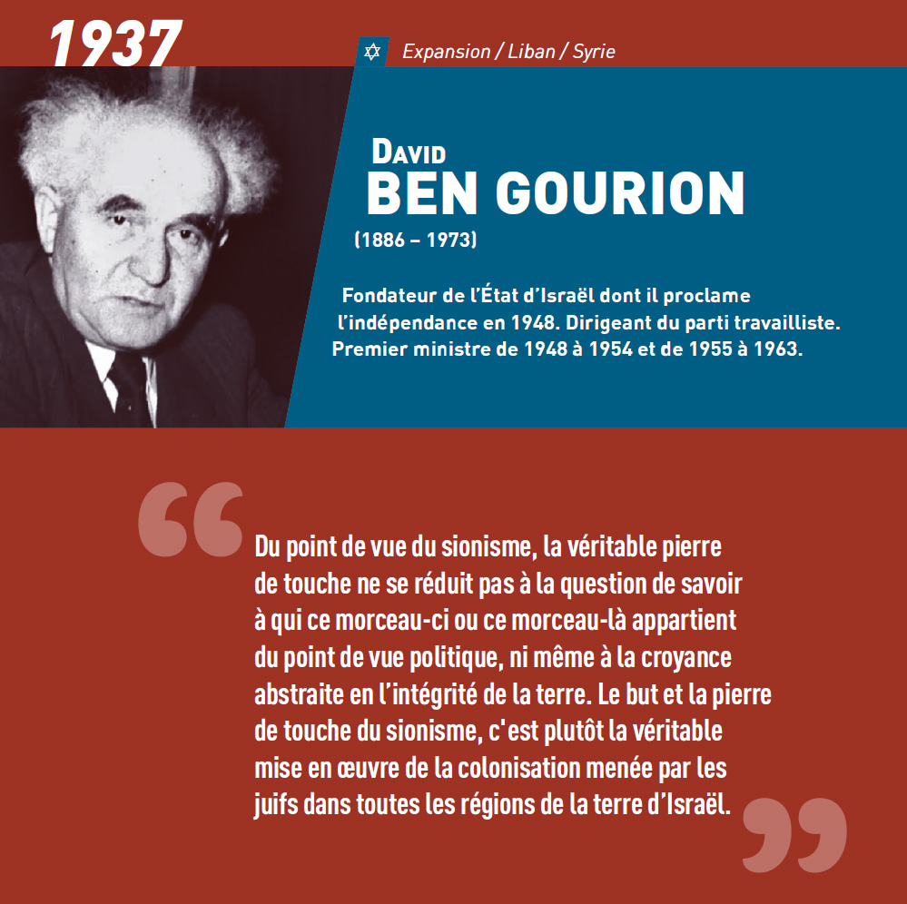 Ben Gourion : «Du point de vue du sionisme, la véritable pierre de touche ne se se réduit pas à la question de savoir à qui ce morceau-ci ou ce morceau-là appartient du point de vue politique, ni même à la croyance abstraite en l'intégrité de la terre. Le but et la pierre de touche du sionisme, c'est plutôt la véritable mise en oeuvre de la colonisation menée par les juifs dans toutes les régions de la terre d'Israel» (in Moshe Machover, Israelis and Palestinians : Confict & resolution, Haymarket Books, 2012 ; Je tiens à signaler que plusieurs citations reprenant les déclarations de dirigeants sionistes citées dans cet article sont puisées dans l'ouvrage de Jean-Pierre Bouché et Michel Collon, Israël, les 100 pires citations, Ed. Investig'action).