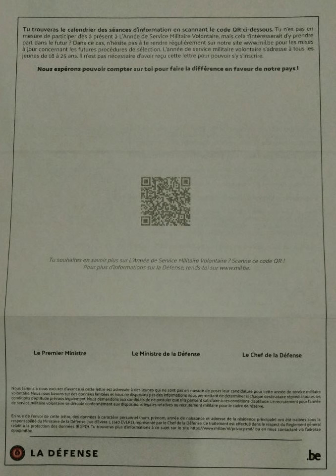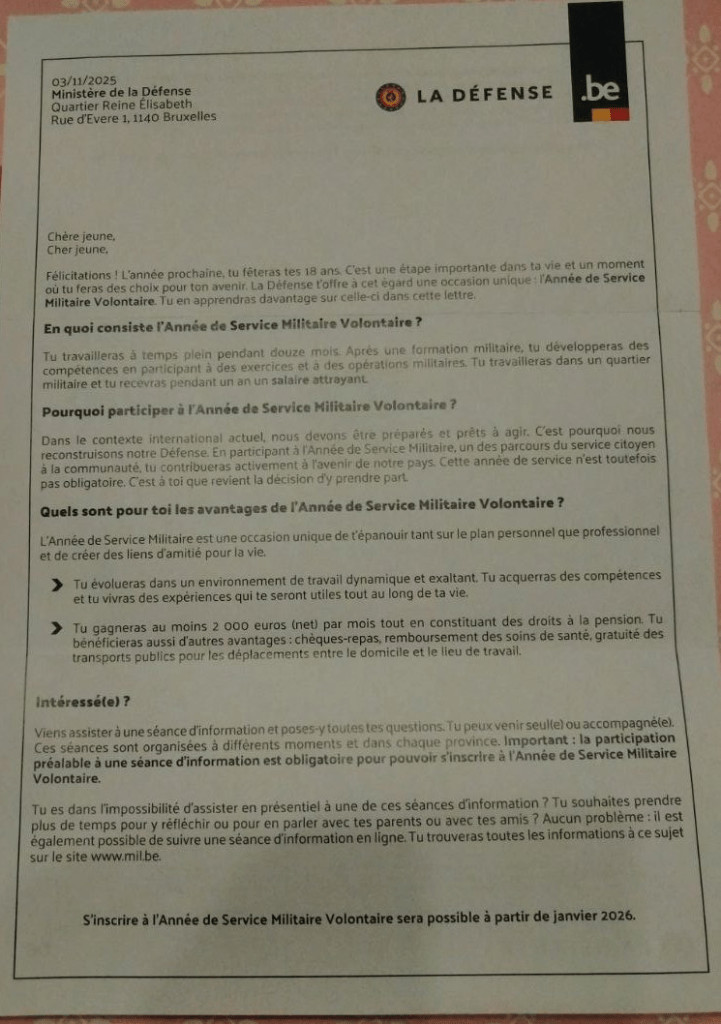 Un fidèle lecteur belge vient de nous adresser copie du courrier envoyé par le ministère belge de la Défense à son fils qui aura bientôt dix-huit ans.