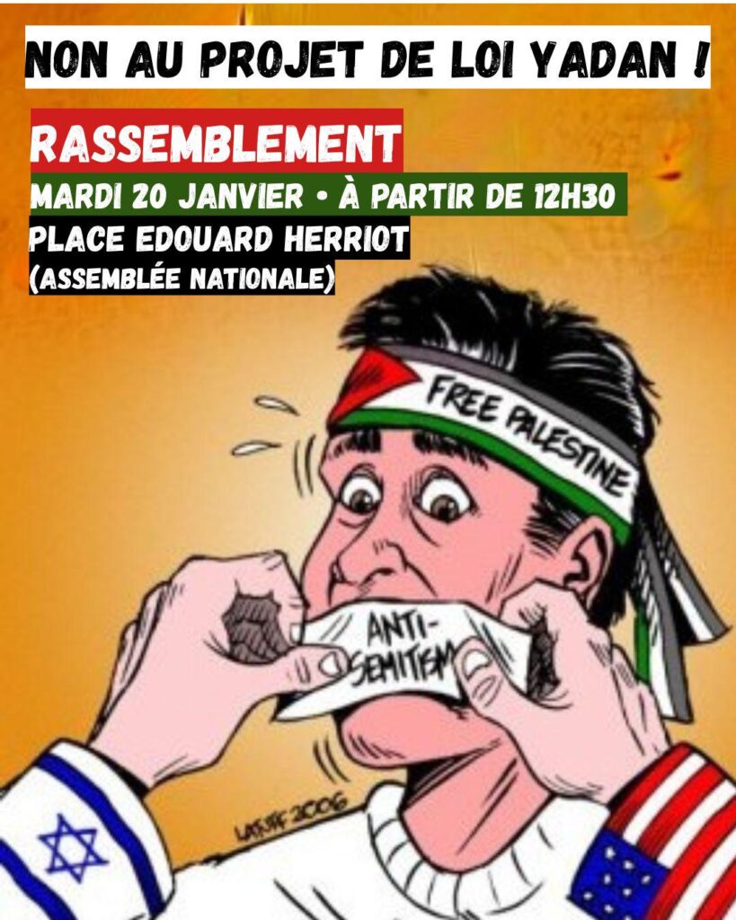 La proposition de loi « Yadan », qui doit être examinée mardi 20 janvier par la Commission des Lois de l'Assemblée Nationale, vient tout juste d'être réécrite par ses promoteurs, tout en restant un texte visant à réprimer encore plus durement la critique du régime génocidaire israélien.