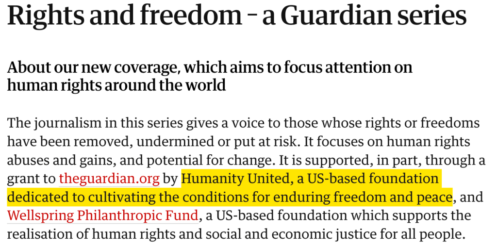 Much of Parent's work at The Guardian's so-called "Rights and Freedom" section has been funded by an NGO called Humanity United, which was founded by tech billionaire Pierre Omidyar and his wife, Pam.