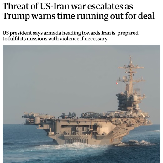 « Le président américain affirme que l'armada se dirigeant vers l'Iran est « prête à remplir ses missions par la violence si nécessaire » ». C'est là une façon détournée du Guardian de masquer le fait que Trump s'apprête à violer le droit international en menant une guerre d'agression, un crime suprême.