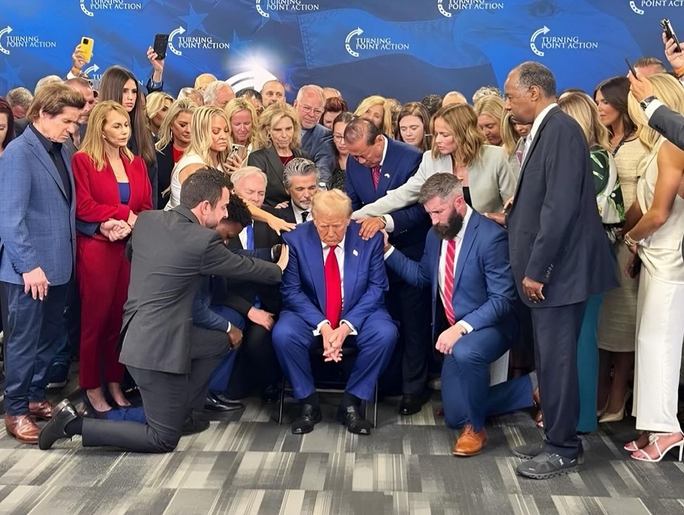Donald Trump se faisant bénir par des chefs religieux lors d'un événement de Turning Point Action en Géorgie le 23 octobre 2024. La vidéo ICI .