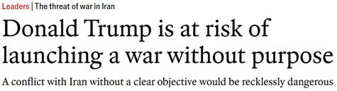 De plus, certains appels à la non-intervention, présentés comme de faux héros, ne sont pas ce qu'ils paraissent être : il s'agit plutôt de tentatives détournées visant à "influencer" Trump afin qu'il présente la guerre de manière plus crédible et permette ainsi aux plans barbares d'Israël de se dérouler sans accroc. Par exemple, le premier article de The Economist, intitulé "Trump risque de déclencher une guerre sans but", se veut une sorte d'apologie de la paix, jusqu'à ce qu'on lise entre les lignes et qu'on comprenne qu'il s'agit simplement d'inciter Trump à trouver un argumentaire convaincant pour l'opinion publique américaine avant de passer à l'acte.