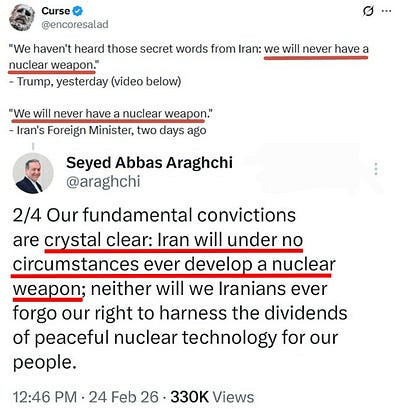 Pendant ce temps, Trump et sa bande de clowns continuent de se discréditer par des messages totalement contradictoires. Par exemple, lors du cirque médiatique qu'a été le discours sur l'état de l'Union hier soir, Trump a affirmé qu'il suffisait à l'Iran de "prononcer les mots magiques" pour que des frappes imminentes soient évitées, en promettant de ne pas se doter de l'arme nucléaire. ( source : NYT)
