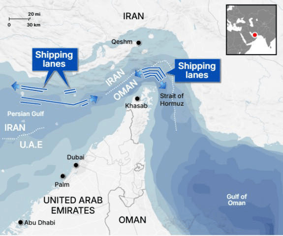 Environ 20% des approvisionnements mondiaux en pétrole, GPL et engrais doivent passer par le détroit d'Ormuz. L'Iran avait depuis longtemps annoncé que le détroit serait fermé si le pays était attaqué. Il a tenu sa promesse. Depuis, quelques petits navires ont tenté de passer par le détroit, mais ils ont été stoppés par des frappes iraniennes. Les compagnies d'assurance maritime ont cessé de couvrir tout passage par le détroit.