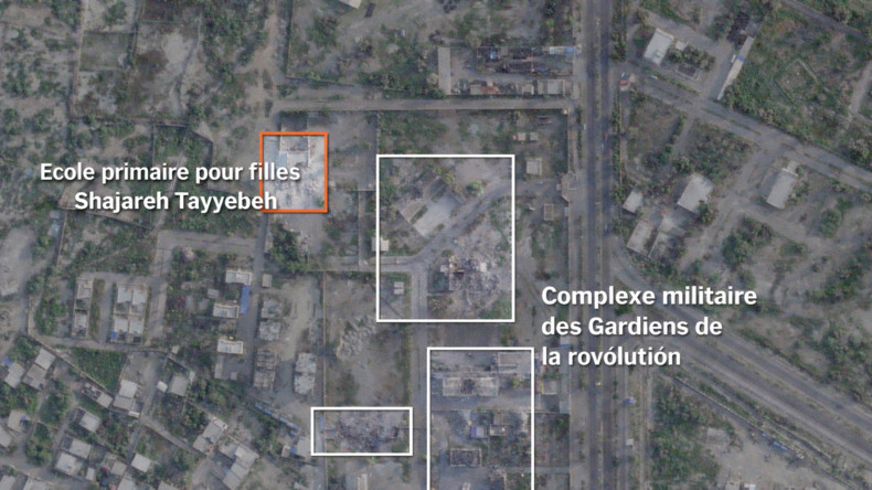 Image satellite de Minab montrant la proximité entre l'école primaire pour filles Shajareh Tayyebeh, touchée le 28 février, et un complexe militaire des Gardiens de la révolution.