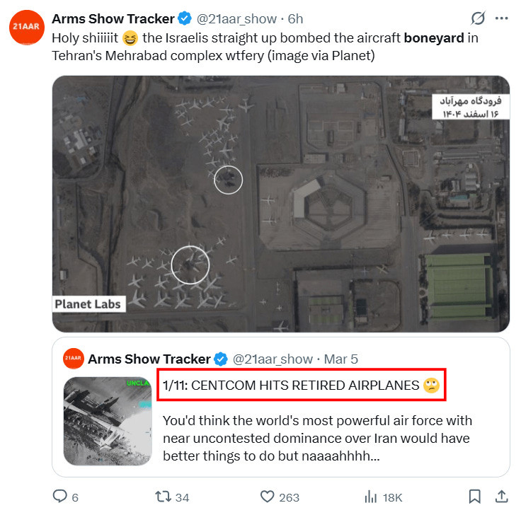 Il convient de rappeler que le nombre de frappes américaines a également diminué, passant de près de 1.000 le premier jour à environ 200 à 300 par jour, voire moins, depuis lors ; et que nombre de ces frappes, sinon la plupart, visent des cibles superficielles pour "gonfler le score", comme un cimetière d'avions qui a certainement ajouté quelques dizaines de "points" à la liste "impressionnante" des frappes :