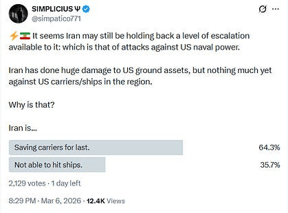 L'autre point crucial, et pourtant souvent négligé, concerne les porte-avions américains. Nul ne sait avec certitude si l'Iran a tenté d'en frapper un sans y parvenir, ou s'il réserve cette option comme ultime recours. On pourrait penser que l'assassinat du Guide suprême représente l'escalade ultime de la part des États-Unis, ce qui aurait dû, en théorie, déclencher l'utilisation de toutes les options par l'Iran. Or, nous savons que ce n'est pas le cas, car même aujourd'hui, le président Pešekian a présenté des excuses pour avoir frappé des pays arabes voisins et promis d'y mettre fin, alors même que les Gardiens de la révolution iraniens ont semblé le défier peu après en frappant le Koweït et d'autres États - illustrant une fois de plus la nouvelle stratégie d'influence indépendante que met en œuvre l'armée iranienne.