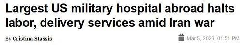 Par ailleurs, le plus grand hôpital militaire américain à l'étranger a annoncé l'arrêt total de ses activités liées à l'accouchement afin de se concentrer sur les victimes du conflit iranien :
