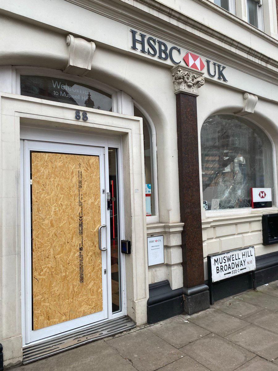 Des manifestants du groupe "People Against Genocide" ont pris pour cible une agence HSBC à Muswell Hill, à Londres, l'obligeant à fermer temporairement.