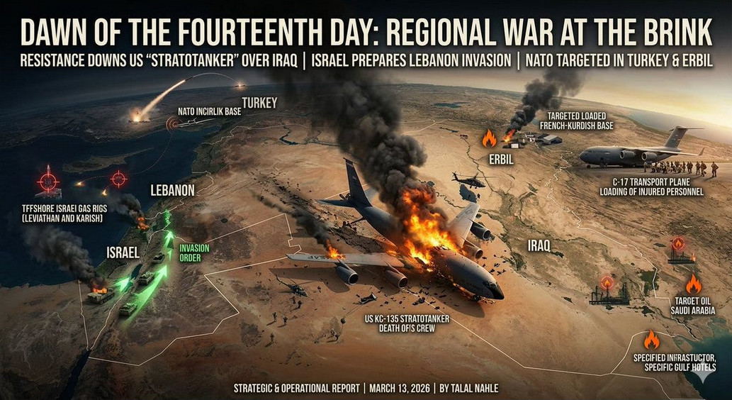Aube du quatorzième jour : la Résistance abat un "Stratotanker" américain au-dessus de l'Irak et tue son équipage... Israël se prépare à envahir le Liban avec le soutien de Trump, tandis que l'OTAN est prise pour cible en Turquie et à Erbil. - Talal Nahle