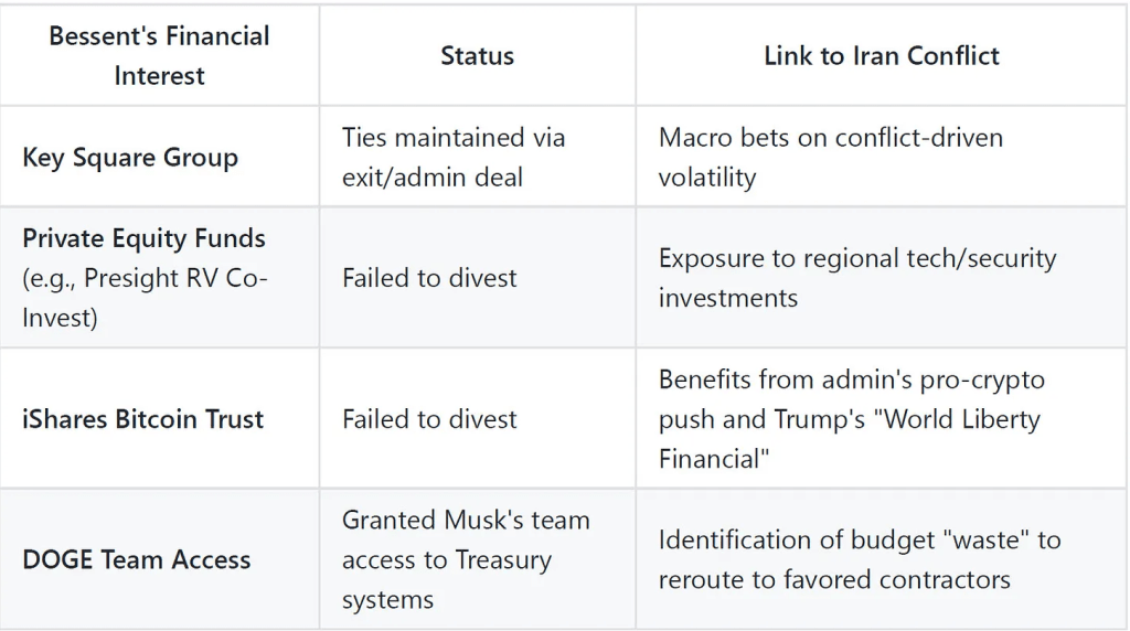 Bessent a accepté de se défaire de 28 actifs, notamment des fonds de capital-investissement et des fonds de Bitcoin. Il n'y est pas parvenu dans le délai requis de 90 jours. Des plaintes pour manquement à l'éthique ont suivi. Le Campaign Legal Center et la Democracy Forward Foundation ont déposé des plaintes officielles alléguant qu'il détenait des actifs spécifiquement pour tirer profit de la volatilité qu'il contribuait à créer.