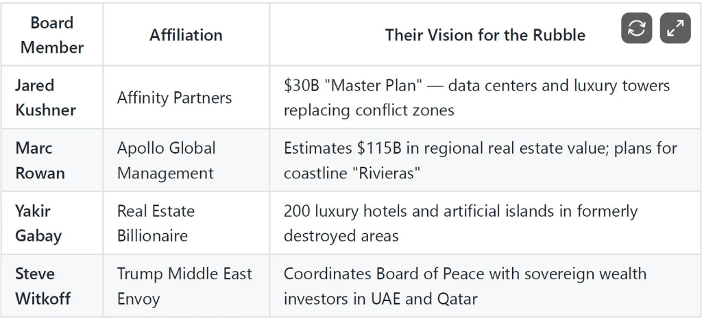 Au niveau du conseil : Kushner et le Conseil de la paix vendent déjà l'Iran d'après-guerre aux monarchies du Golfe - empochant 25 millions de dollars par an en frais de gestion avant même qu'un seul bâtiment ne soit reconstruit sur les décombres.