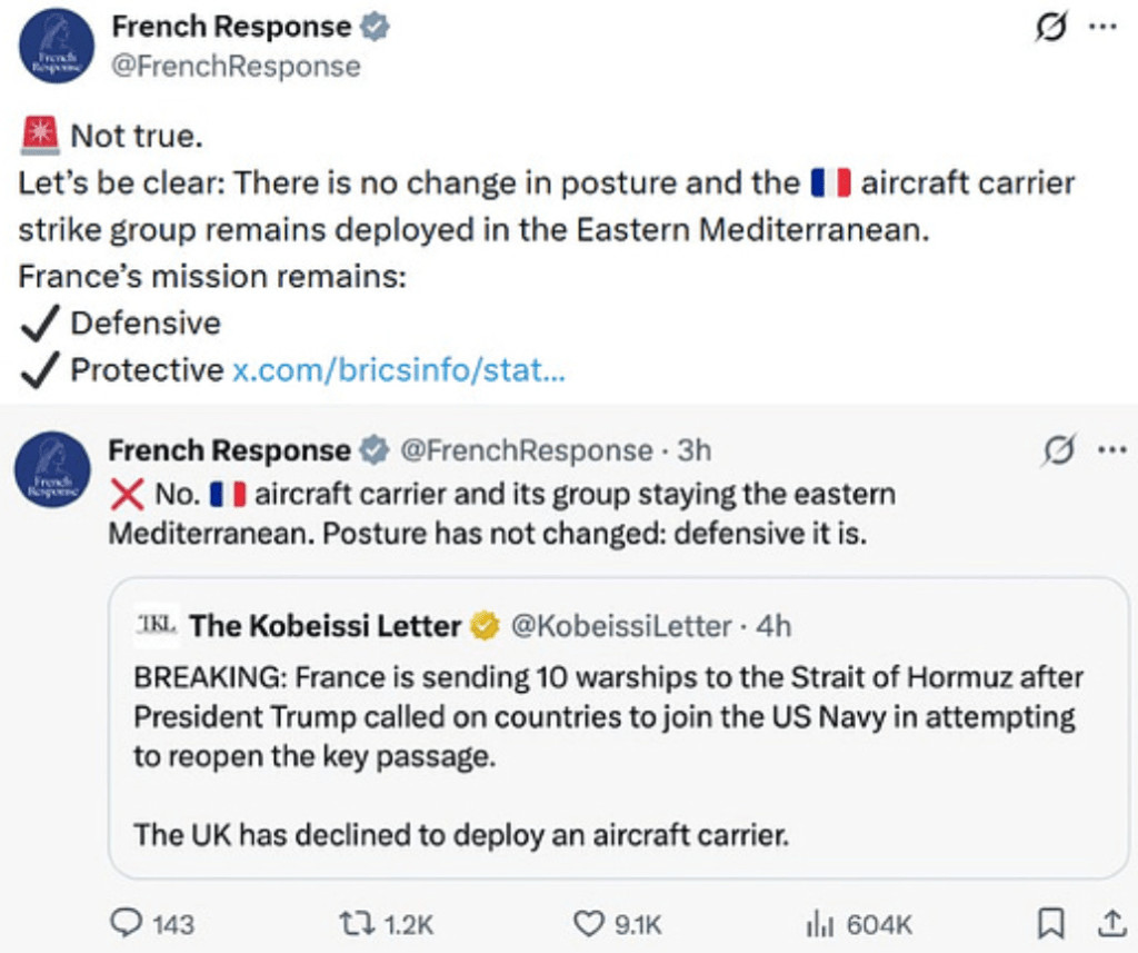 Après avoir imploré maladroitement ses alliés et affirmé qu'une coalition se formait pour débloquer le détroit, Trump s'est heurté au refus de la France de participer. Le compte Twitter officiel du ministère français des Affaires étrangères a réaffirmé à plusieurs reprises sur X que le groupe aéronaval français ne se déplacerait pas et ne participerait pas à la tentative dangereuse de déblocage du détroit entreprise par Trump.