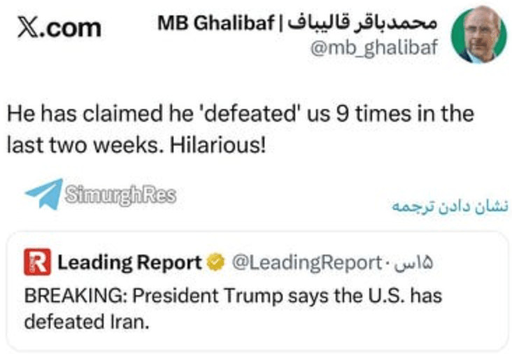 C'est devenu une plaisanterie récurrente, le président du Parlement iranien, Mohammad Ghalibaf, ridiculisant les dernières sorties de Trump :
