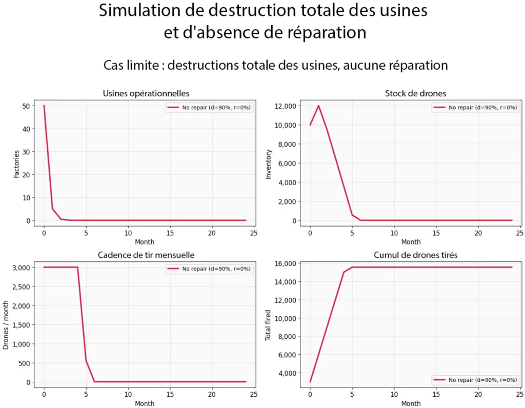 Le modèle présenté vise ainsi à illustrer la logique d'une guerre industrielle de drones. Les paramètres utilisés - capacité de production, rythme de destruction et de réparation des sites - reposent toutefois sur des hypothèses plausibles mais non vérifiables publiquement. Les résultats doivent donc être interprétés comme une exploration de scénarios plutôt que comme une estimation exacte des capacités réelles.