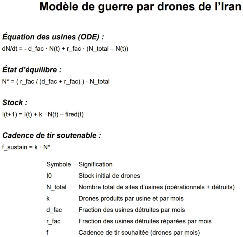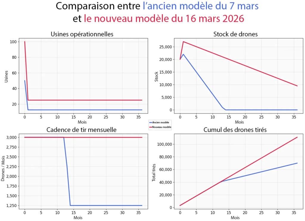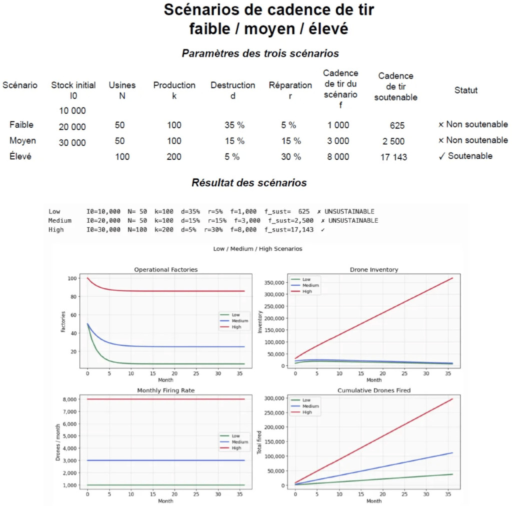 L'élément central du modèle est la cadence de tir soutenable : si la production industrielle reste supérieure au nombre de drones tirés chaque mois, le stock se maintient ou augmente ; dans le cas contraire, il finit par s'épuiser et la campagne d'attaque ne peut plus être maintenue.