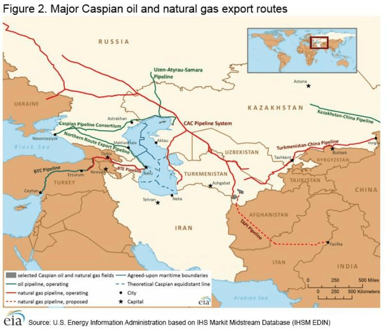Contrairement aux États pétroliers du golfe Persique, le bassin caspien ne dispose d'aucun débouché maritime direct sur les océans. Les hydrocarbures extraits de la région doivent donc transiter par de longs réseaux de pipelines traversant des territoires politiquement sensibles avant d'atteindre les marchés internationaux. Dans ce contexte, les pipelines cessent d'être de simples infrastructures : ils deviennent la matière première de la géopolitique.