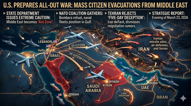 En cette soirée du vingt-quatrième jour, la poussière de la supercherie américaine retombe. L'annonce de Trump de "reporter les frappes de 5 jours" sous prétexte de négociations n'est ni un "désengagement" ni une capitulation face à la dissuasion iranienne. Il s'agit plutôt d'une "trêve tactique sournoise" destinée à berner les marchés mondiaux, et surtout à gagner du temps pour mener à bien l'évacuation la plus importante et la plus complexe de citoyens et de diplomates américains de tout le Moyen-Orient (d'Israël à l'Arabie saoudite et au Golfe).