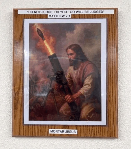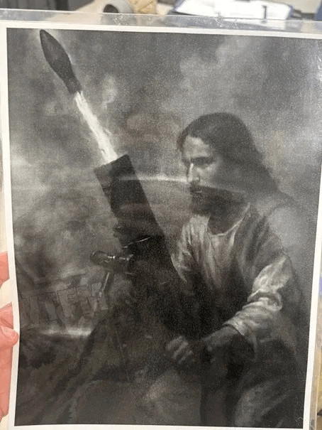 "Moi et quelques sous-officiers faisions des trucs dans l'espace de travail de notre quartier général de bataillon ici à [XXX] et nous avons découvert une affiche de Jésus tirant un obus de mortier qui avait été laissée par l'unité précédente que nous avons remplacée. Le bâtiment où nous l'avons trouvée était auparavant le QG du commandement de cette unité. Cela m'a vraiment inquiété que l'unité précédente ait pu avoir quelque chose comme ça, surtout compte tenu des rapports faisant état de commandants au Moyen-Orient disant à leurs soldats que la guerre avec l'Iran est une guerre sainte et que Dieu a oint Trump pour provoquer l'apocalypse"