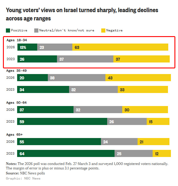 Dans la tranche d'âge 18-34 ans, les opinions favorables envers Israël ne sont plus que de 13% en 2026 (26% en 2023). Les opinions défavorables passent de 37% à 63% au cours de la même période. Le sondage constate cette baisse dans toutes les tranches d'âge
