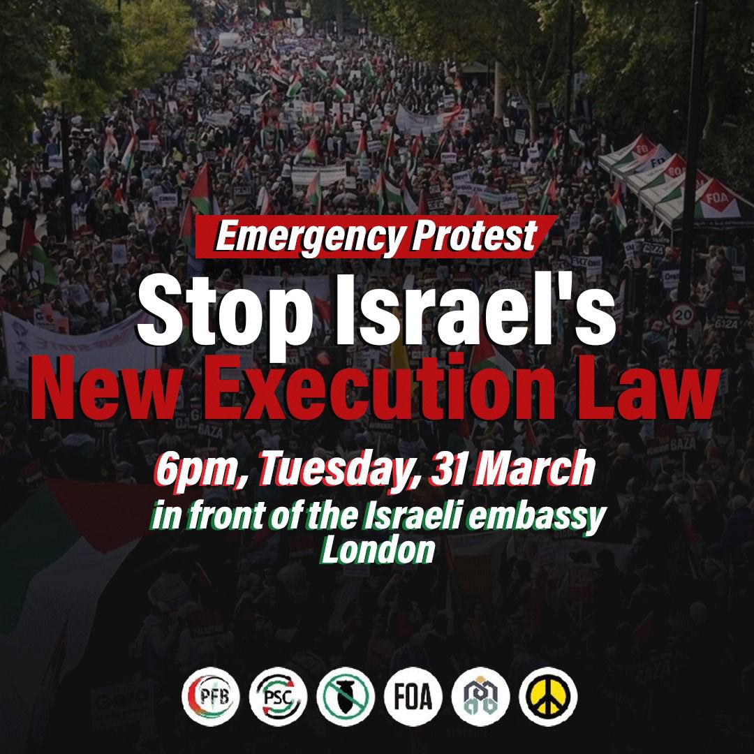 Des militants et des défenseurs des droits des Palestiniens appellent à une manifestation urgente devant l'ambassade d'Israël à Londres demain, mardi 31 mars à 18h, en réaction à la nouvelle loi israélienne imposant la peine de mort exclusivement aux détenus palestiniens.