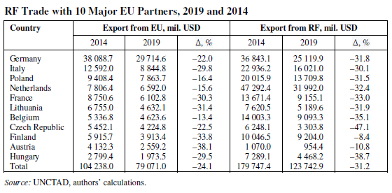 En el artículo de la Revista checa de Economía, titulado El efecto de las sanciones en el comercio UE-Rusia: Estudio para 2015-2019, en la página 746 del trabajo, se aprecia en la tabla, Comercio de la Federación Rusa con 10 socios importantes de la UE, 2019 y 2014, un descenso significativo del intercambio comercial entre la Federación de Rusia RF, y países de la Unión Europea. Los totales dados para un quinquenio son explícitos.
